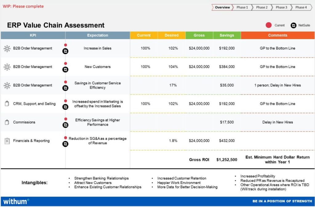 When implementing Oracle NetSuite ERP, Withum leverages partner tools such as the ERP Value Chain Assessment. During this implementation, the Withum team assessed and identified operating environment stages and then moved specific processes from Marginal to Innovative and/or Competitive to Innovative. This project yielded many quantitative processing efficiencies to support “Doing More with Less” and qualitative outcomes with significant intangible value. For example, employees having secure access to data without contacting anyone who maintains off-system worksheets is a great benefit of the newly implemented ERP – saving time and unnecessary steps. Data transparency and reliability are paramount to the workforce in meeting operational goals. Moving data analysis from off system to a common platform for anyone to utilize from anywhere in the world is a significant competitive advantage. What may seem like small wins, these efficiencies matter greatly for companies who modernize after using outdated, on-premises systems for the last 28 years (like in this example).