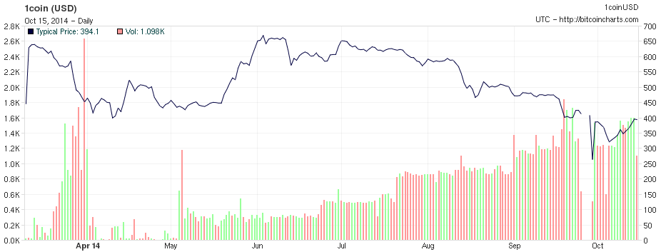 Trading chart of 1 Bitcoin to the United States Dollar since March 2014