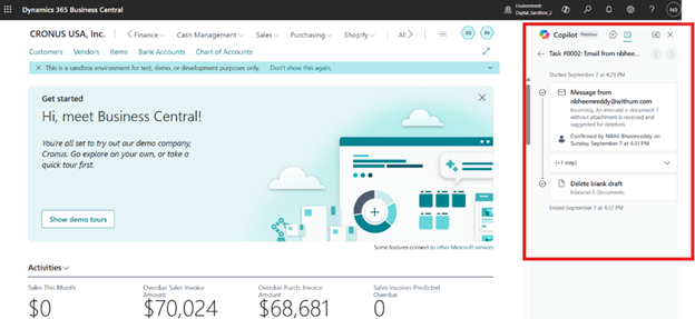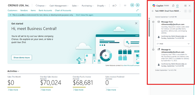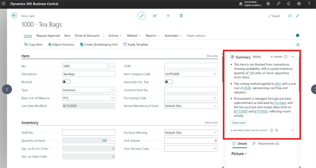- Record summaries: A new FactBox provides quick, AI-generated summaries on records (e.g., items, orders) to speed decision-making.