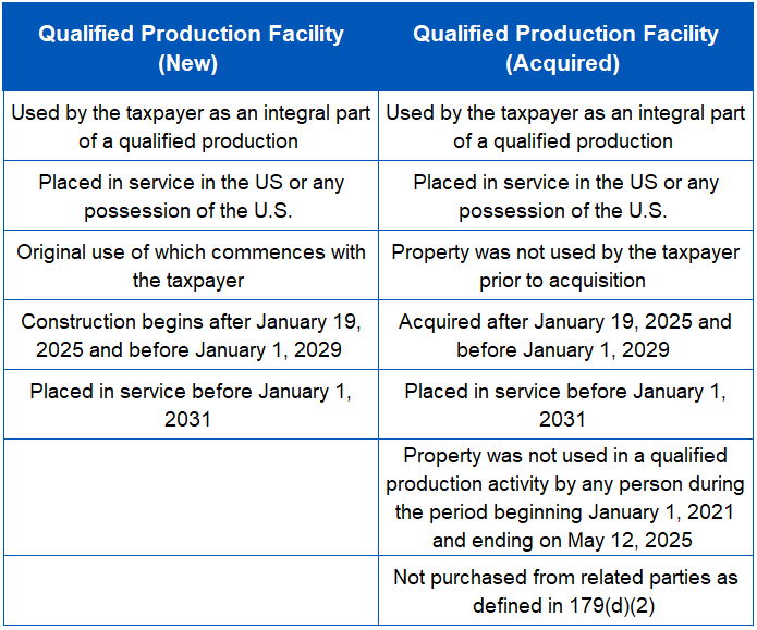 The OBBBA provides taxpayers with an election to take 100% bonus depreciation for new or newly acquired non-residential real property manufacturing facilities. Qualified production activity includes the manufacturing, production or refining of a qualified product when substantial transformation takes place.